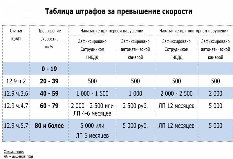 В соответствии с российскими ПДД допускается превышение скорости на 20 км/ч относительно значения, предписанного знаками или правилами. Но водитель может не заметить очередной знак (например, из-за обгона грузовика на многополосной дороге) либо просто махнуть на него рукой – ведь почти каждый человек в душе считает себя гонщиком. Сумма штрафа составит от 500 до 5000 руб., а при серьезном превышении (свыше 60 км/ч) можно расстаться с правами на срок от 4 месяцев до года.