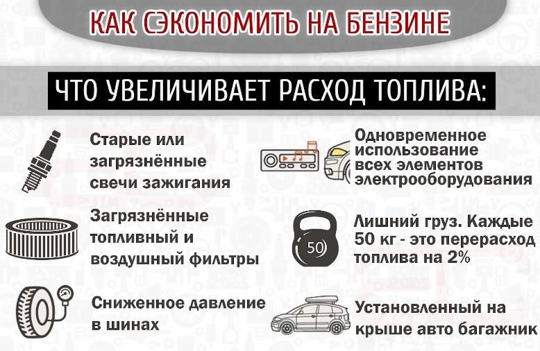 На расход горючего влияют также нестандартные брызговики, накладки на кромку капота или оконные проемы дверей, широкая резина, сорванные штатные уплотнители в щелях между панелями кузова. Установка «аэродинамических» элементов на бамперы или крышку багажника может и украшает автомобиль, но негативно сказывается на коэффициенте сопротивления и топливной экономичности.