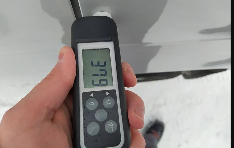 Толщиномер. С ним вам понадобится всего 3 минуты, чтобы выявить лишний слой шпаклевки и краски. На заводских кузовных панелях показания толщиномера одинаковые – варьируется в пределах 70-150 мкм. Все что больше, означает перекраску и шпаклевку. Например, вот такой показатель на приборе говорит о том, что поверх заводского лака положили слой краски и лака.