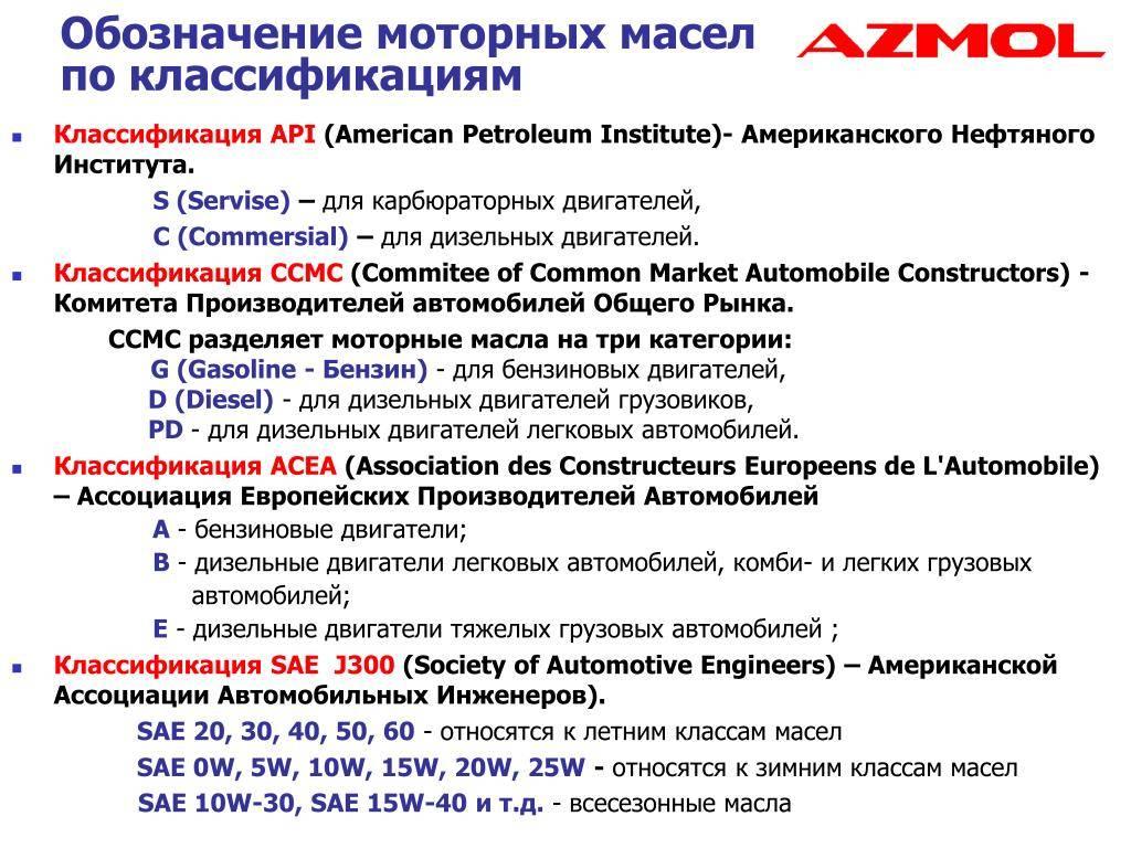 - классификациям по стандартам SAE, API либо ACEA;