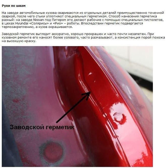 Покупка машины, побывавшей в серьезной аварии, нежелательна. Найти следы кузовного ремонта достаточно легко – необходимо сравнивать внешний вид полос герметика и проверять наличие сварных точек по разным сторонам в моторном отсеке и багажнике. Если продавец не разрешает снять для осмотра резиновые уплотнители по проемам дверей, то можно прекращать осмотр.